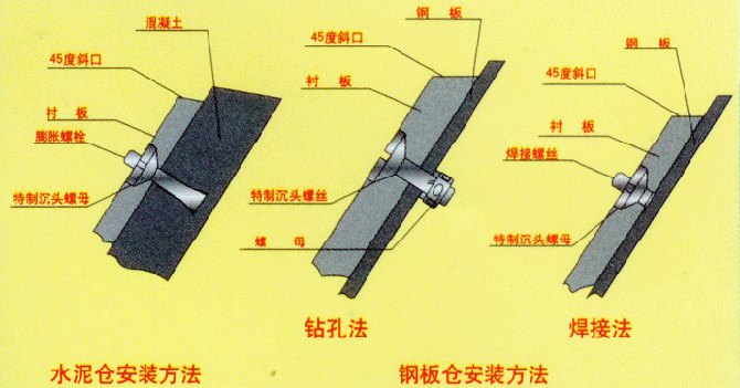 任何一種固定方法,設(shè)計(jì)時(shí)都應(yīng)考慮到有利于散裝物料的流動(dòng),并且螺釘頭母總是埋入襯板內(nèi)。